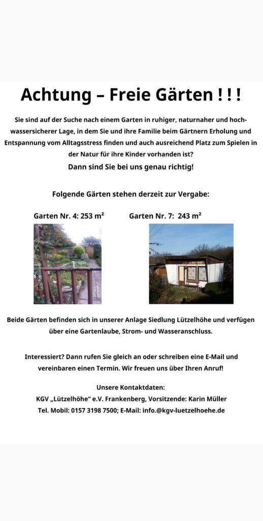 Wir haben Ihr Interesse geweckt, dann freuen wir uns über Ihren Anruf unter Tel. 0157 3198 7500 oder Ihre E-Mail an vorstand@kgv-luetzelhoehe.de.